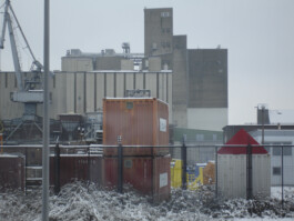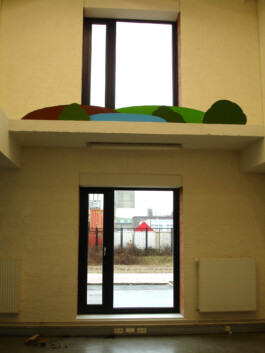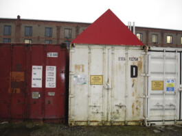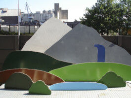 Zwei Kulissen: eine Dachkulisse im Außenraum auf einem Container im Hafengelände, ein Landschaftskulissen-Ensemble auf einer zweiten Ebene im Innenraum (HfK Bremen).