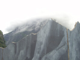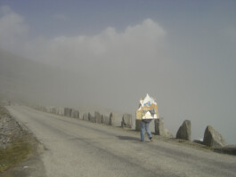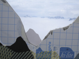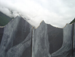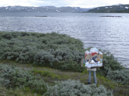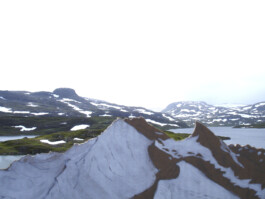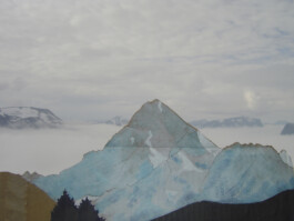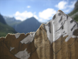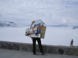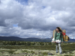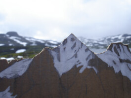 Die Arbeit Bergwanderung ist eine Diashow, in der »Reisebilder« der besonderen Art gezeigt werden: Mit »falschen« Bergen als Gepäck auf dem Rücken, durchstreifen wir die norwegische Landschaft, platzieren diese an ausgewählten Orten und lassen in der Verschmelzung beider Elemente neue Naturbilder entstehen. Die Bühne unserer »künstlichen« Natur ist die Natur selbst; durch Aufstellen der Bergattrappen bekommt die dahinterliegende Landschaft einen kulissenhaften Charakter.