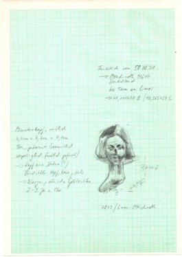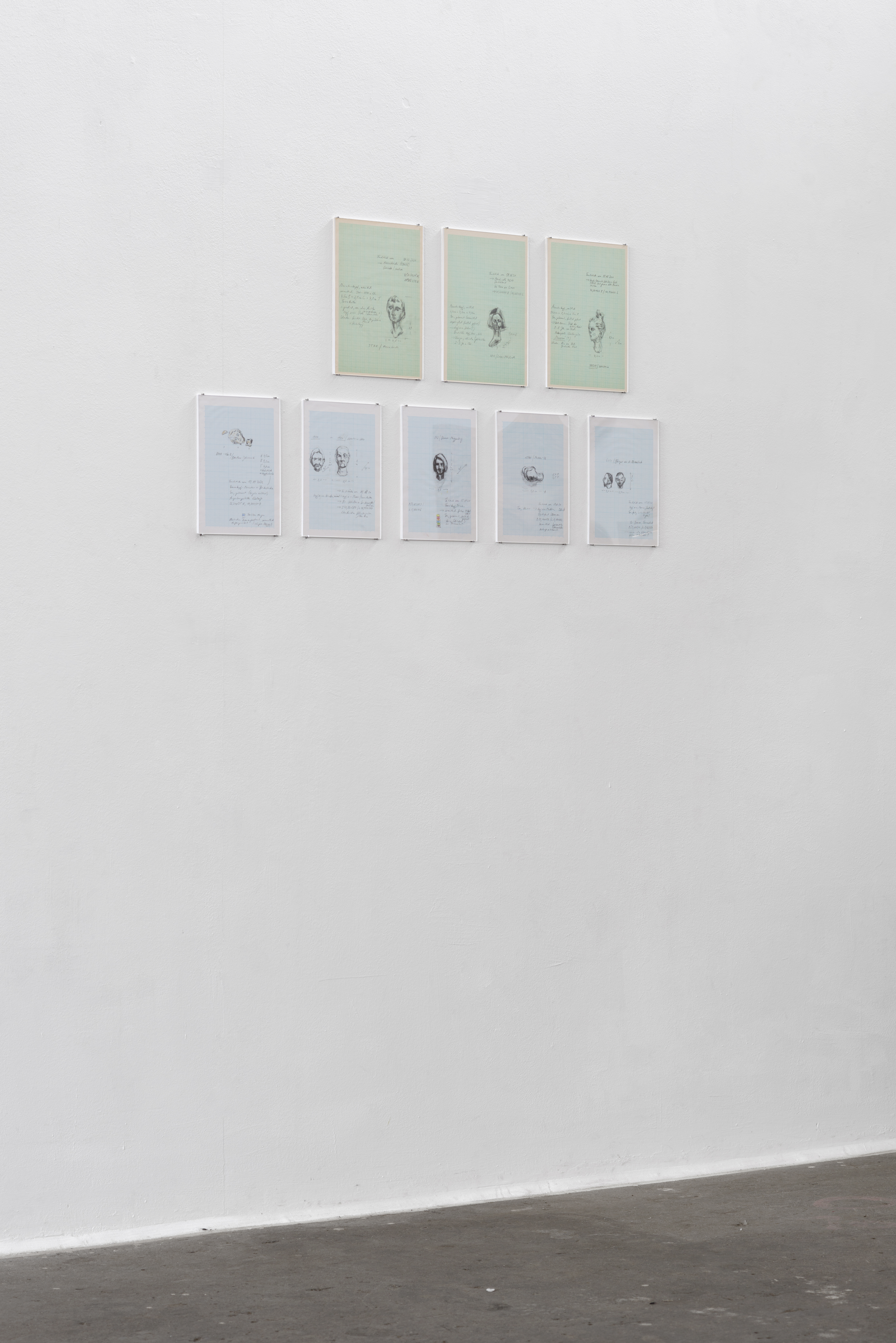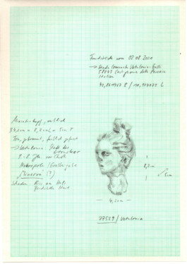 Köpfe aus Ton, en miniature, sind in einem zur Ausstellungsvitrine umgebauten Möbelstück, neben- und hintereinander gereiht, schlicht präsentiert auf Acrylglasstäben in Acrylglasblöcken. Ebenso sind modellierte und gebrannte, z.T. farblich bearbeitete, mit Bruchstellen retuschierte oder in Holz geschnitzte Miniatur-Körperteile und Fragmente präsentiert. Alles handwerklich sehr kunstvoll ausgeführt, beschriftet und datiert in musealer Manier. Die Köpfe und Objekte sind frei erfunden, mitunter angelehnt an Votivfiguren, Grabbeigaben, Schutzheiligen oder anderen Bruchstücken antiker Skulpturen bis hin zum Abbild moderner Menschen. Die Vitrine wird ergänzt durch Fotos und Zeichnungen, die die Funde dokumentieren: Ausgrabungsorte im In- und Ausland, die Einmessung des Feldes und der Fund durch die Archäologin-Künstlerin, Grabungsskizzen mit der Auflistung der geographischen Koordinaten und die Vergabe der Inventarnummer.