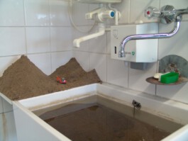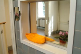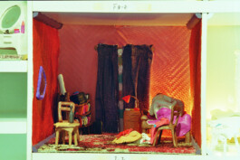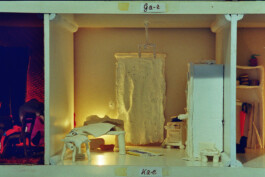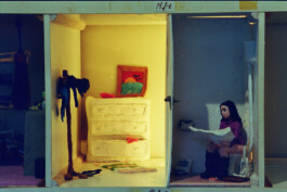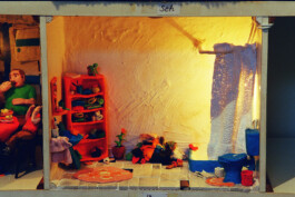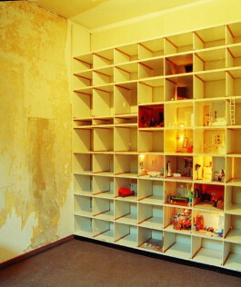 In einem ehemaligen Büroraum eines Abrisshauses habe ich das vorgefundene, nach einem alphabetischen System angelegte Aktenregal umfunktioniert zu einem Hochhaus. In den einzelnen Fächern entstanden individuelle Wohnräume. Typische Klischees von unterschiedlichen sozialen Wohnverhältnissen und zwischenmenschlichen Situationen werden vom Interieur und von meinen Charakteren verkörpert. Die Ordnung entspricht dem Wohnen – Tür an Tür, neben und übereinander.