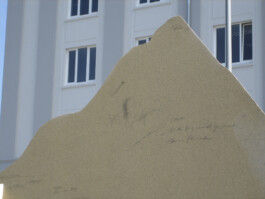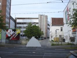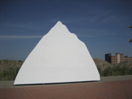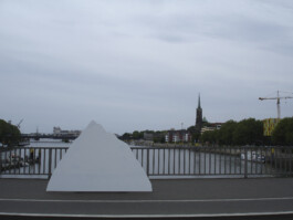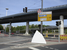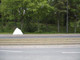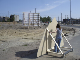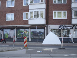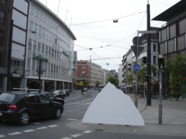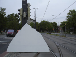 Ein Berg legt eine Strecke zurück. Ich bewege eine fahrbare Kulisse durch die Stadt. Des Betrachters Sicht fällt dabei, je nach Blickwinkel, frontal auf die Bildfläche des Berges oder auf die Seite der Konstruktion. Der Berg verliert durch die Platzierung in die Stadtlandschaft seinen majestätischen Charakter - wirkt isoliert. Auf Räder gesetzt und minimiert büßt er seine wesentlichen Eigenschaften - unverrückbar, in den Himmel ragend, ein.