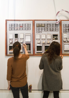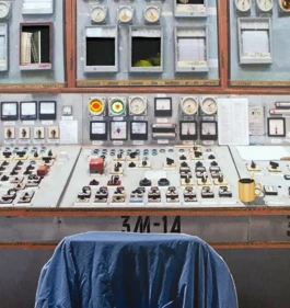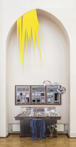 Zu sehen ist ein in die Jahre gekommener technischer Leitstand, der durch sein Arrangement an einen Altartisch mit Retabel erinnert. Weitere Kulissen ergänzen das scheinbar kirchliche Interieur.