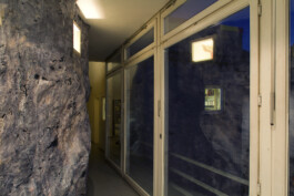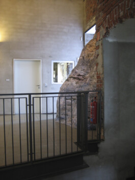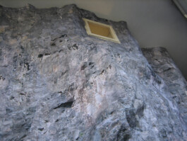 Bei dieser Arbeit interessiert uns die Verschränkung der Begriffe Innen/Außen - Kultur/Natur: u.a. die Platzierung einer Felswand im Innenraum (ehemalige Außenwand), die Setzung eines Fensters in einem »Naturelement«, die Beleuchtung des Berg-Innenraums, sowie die dort verwendeten Tapeten mit floraler Motivik.